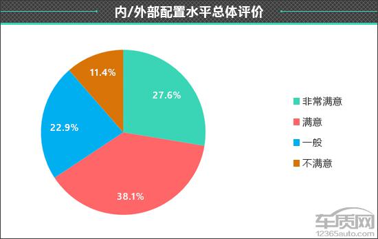 整体而言,该车内外表现符合车主预期,“非常满意”和“满意”的车主占比分别为27.6%和38.1%,“一般”占22.9%,“不满意”占11.4%。