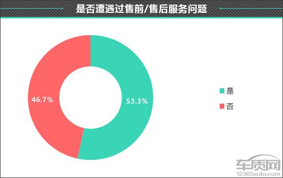 本次调查中,所有车主均选择“授权4S店”进行保养;53.3%的车主(56份问卷)遭遇过售前/售后服务问题。