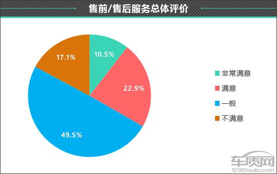 售前/售后服务综合评价中,“非常满意”占10.5%,“满意”占22.9%,“一般”占49.5%,“不满意”占17.1%。
