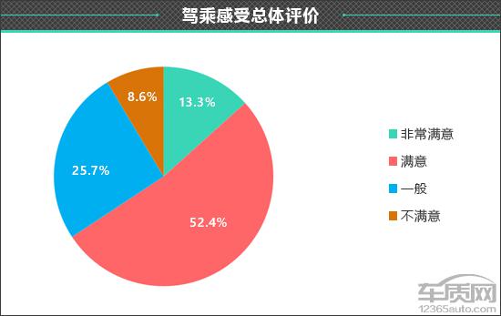 驾乘感受综合评价中,“满意”的车主占比最高,达52.4%,“非常满意”占13.3%,“一般”占25.7%,“不满意”占8.6%。