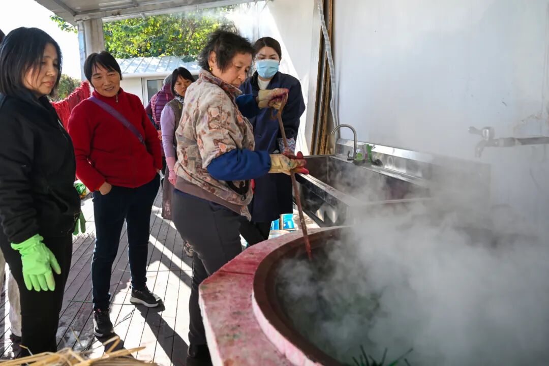 平秀娟一边染色一边和大家聊天,加染料全凭多年经验。徐行草编非遗项目代表性传承人王勤带着团队在旁协助学习,平秀娟边做边教:“黄草染深色,加些白酒和明矾能固色……”毫无保留地传授技艺。