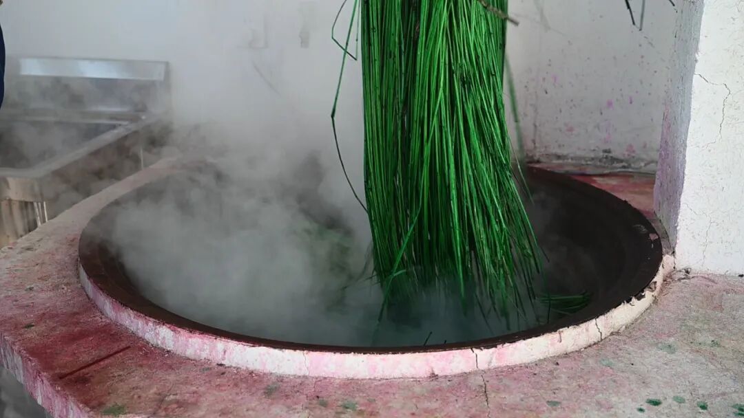 73岁的平秀娟从事黄草染色已有50多年,是徐行镇有名的“染色高手”,掌握着祖传的手艺。她站在直径1米的大锅前,等水煮沸后,熟练地加入染料和黄草,用铁棒搅动。雾气弥漫中,她挑起一捆染好的黄草,重重摔在地上冷却,村民们见状围过来认领自己的黄草。