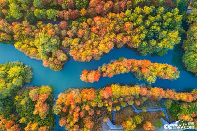 近日,杭州西溪湿地的水杉林层林尽染,红黄交织的树叶倒映在碧水中,木栈道蜿蜒穿梭其间,构成了一幅绚丽的自然画卷。