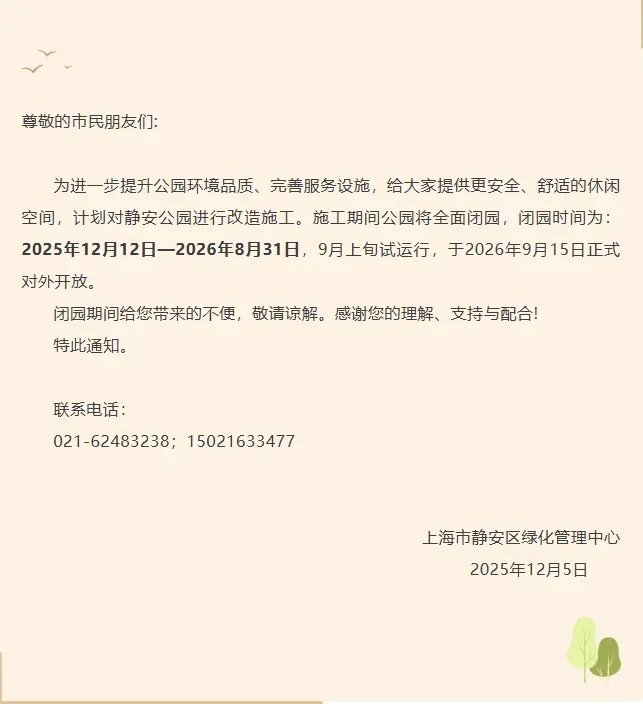 原标题:《静安公园自12月12日起将暂时全面闭园》