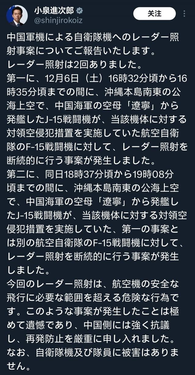 此次雷达照射超出飞行安全必要范围,属危险操作。事件发生极为遗憾,已向中方强烈抗议,并严正要求防止类似事件再次发生。目前自卫队飞机及人员未受损害,详情由事务方后续简报。”