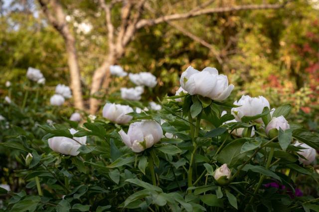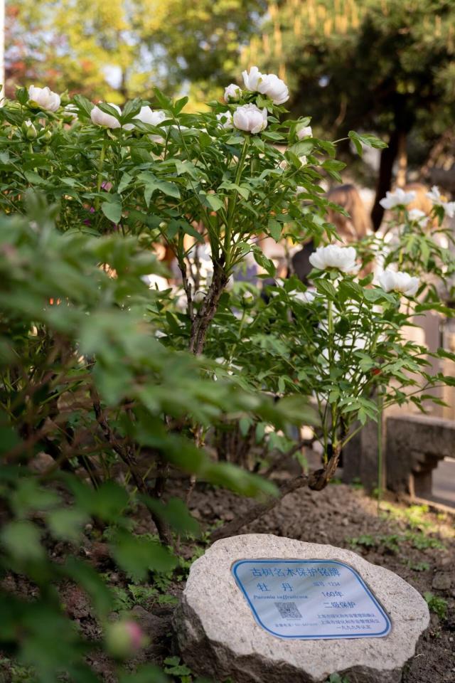 寺内四株清咸丰年间的古牡丹——紫二乔、五龙捧盛、香玉、赵粉,已历160余年。相传咸丰年间,龙华寺与杭州东林寺住持师兄弟用小船将牡丹运至龙华百步桥,栽种于寺内。自唐起佛寺与牡丹文化深度交融,植牡丹成传统。每年四月牡丹绽放,国色天香吸引无数游客,延续佛寺与牡丹的百年情缘。它们与漕溪公园八株古牡丹构成徐汇独特古牡丹群落,是历史使者,传递深厚文化底蕴。