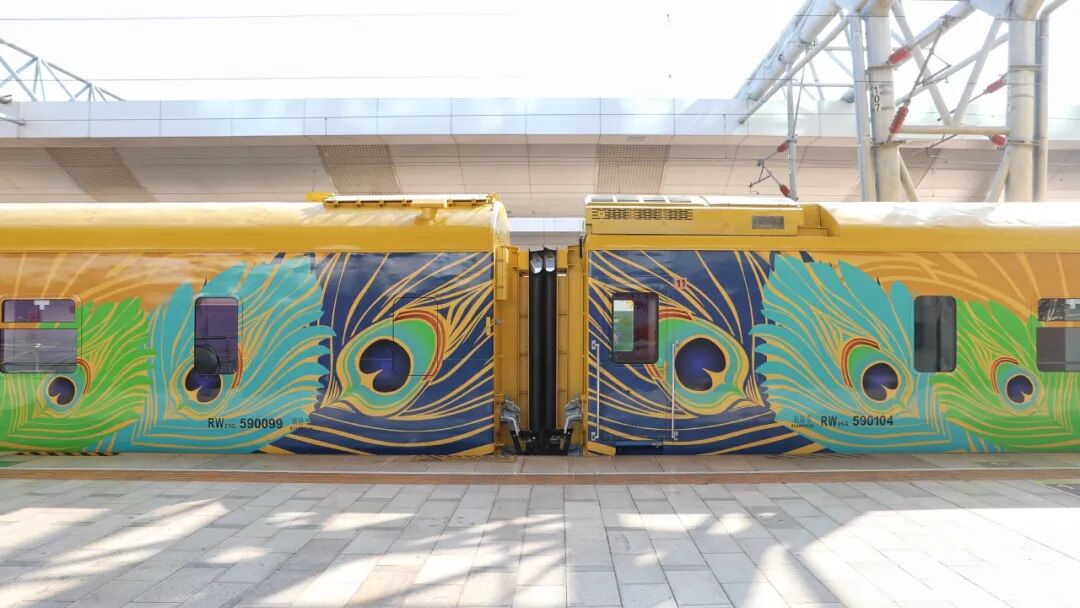 列车车身以金色孔雀为涂装主题,既呼应了云南“彩云之南”的美誉,更成为展示云南文旅魅力的“流动名片”,行驶间宛如一只金色孔雀在铁轨上翩跹,吸睛十足。