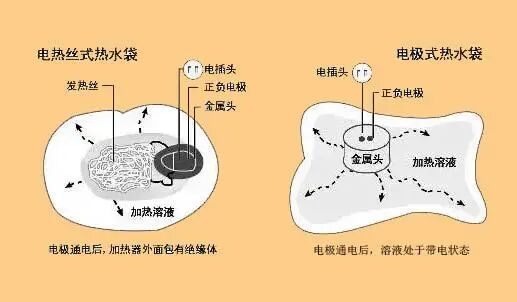 电极式热水袋是通过浸泡在水中的电极直接加热溶液,溶液在工作时处于带电状态,而且水袋里没有温控装置,很容易发生膨胀甚至爆炸。相比之下,电热丝式热水袋的发热体不与液体直接接触,线圈被绝缘体和液体隔离开,安全性相对更高。
