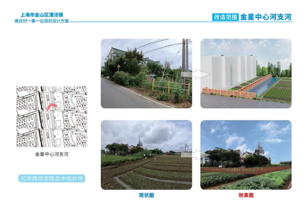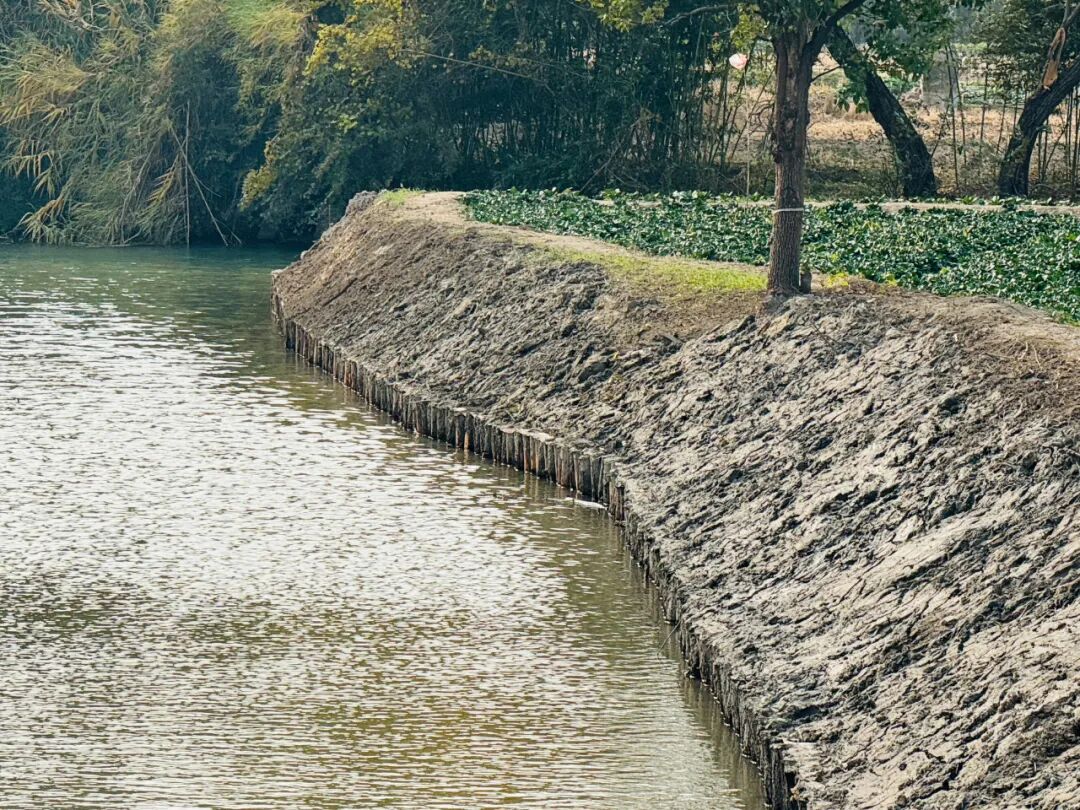在金星中心河支河岸边,新修的坡道平整坚实,木桩排列整齐,河道生态修复已见成效。此次蒋庄村环境提升项目总面积约1200平方米,计划12月底全部完成。