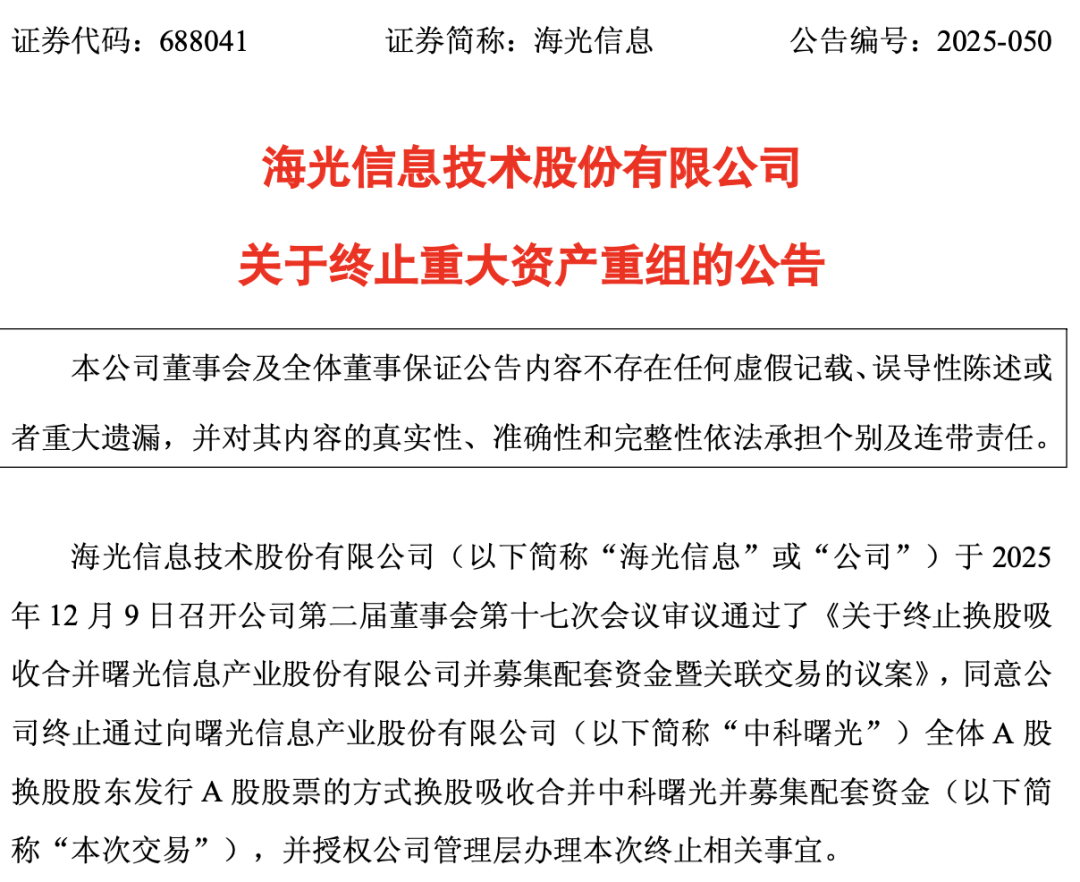 12月9日晚间,海光信息与中科曙光同步发布公告,宣布终止此前筹划的重大资产重组事项。公告指出,终止原因主要是交易规模较大、涉及相关方众多,且当前市场环境与筹划初期相比发生了较大变化。两家公司均明确表示,此次交易终止不会对公司的生产经营及财务状况产生重大不利影响,不存在损害公司及中小股东利益的情况,并承诺自公告披露之日起至少1个月内不再筹划重大资产重组。