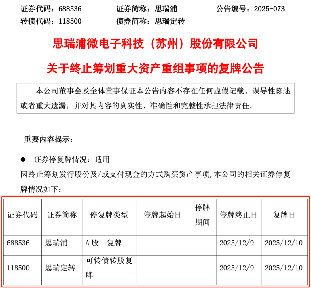 无独有偶,同日晚间,A股知名芯片企业思瑞浦也发布公告称,公司决定终止筹划购买宁波奥拉半导体股份有限公司(简称“奥拉股份”)股权并募集配套资金的重大资产重组事项,公司股票及可转债将于12月10日开市起复牌。