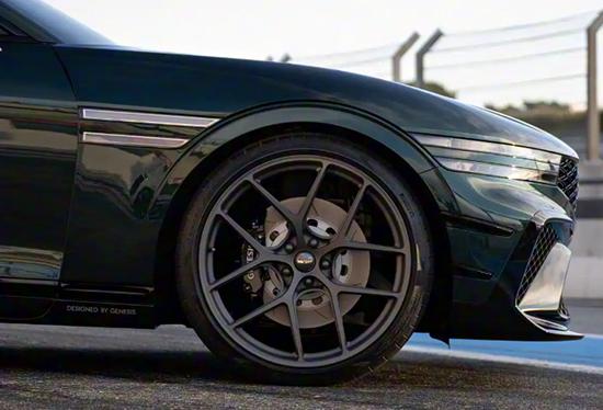 侧面线条流畅优雅,双五辐式轮毂极具战斗气息,匹配倍耐力高性能轮胎。新车基于G90轿车平台打造,轴距达3200mm,车长5100mm。车尾配备双层扰流板,后包围造型富有张力,“大小圆”组合式排气设计也颇为个性。