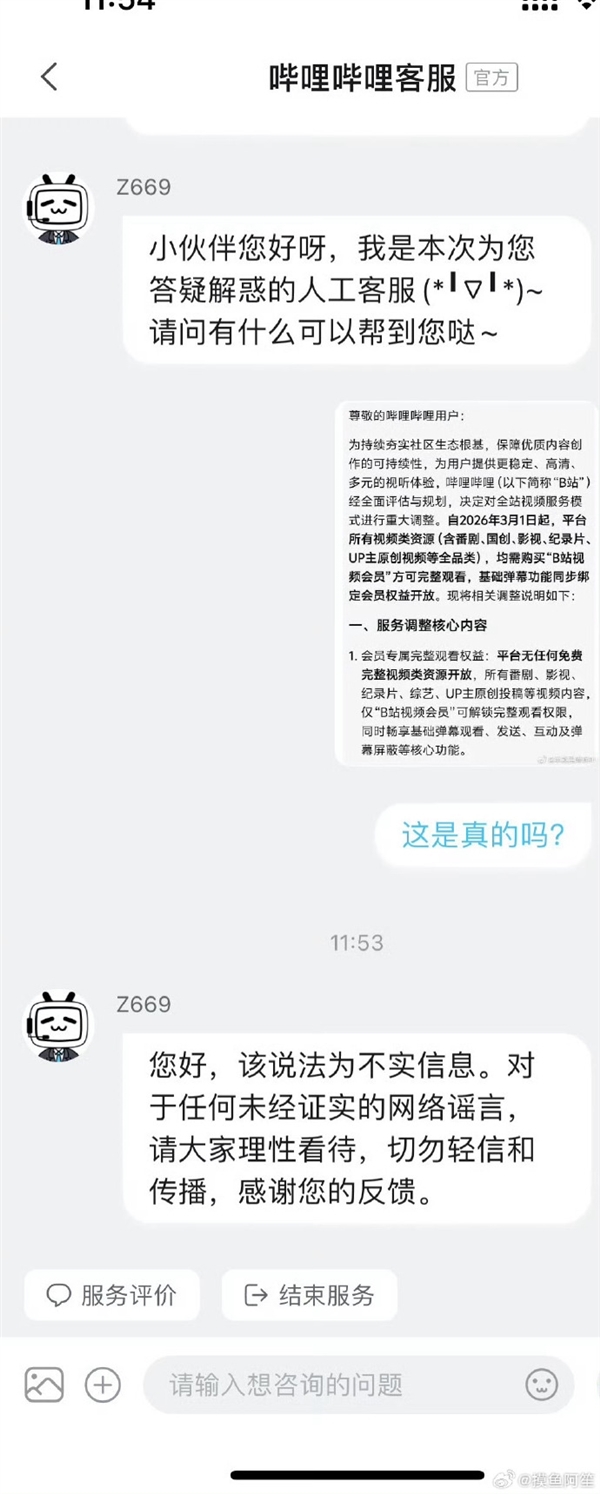 针对这一截图内容,B站客服回应表示:“该说法为不实消息,对于任何未经证实的网络谣言,请大家理性看待,切勿轻信和传播。”