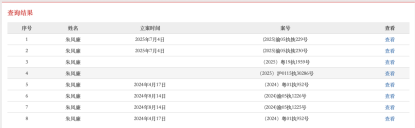 记者从中国执行信息公开网了解到,除了上述执行案件外,朱凤廉还面临7笔执行案件,立案法院涉及广东、重庆、上海等地,立案时间从去年一直延续到现在。