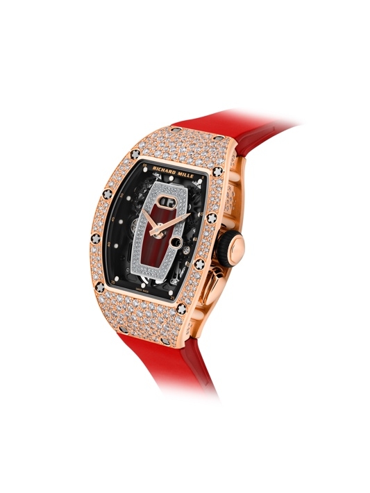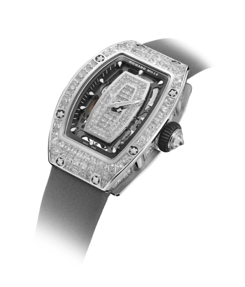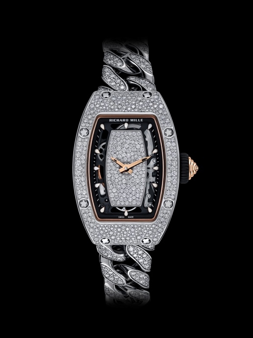 ·RM 07-01白金雪花镶嵌链环款:这款珠宝腕表采用雪花镶嵌工艺,搭配与白金表壳线条延伸的链环式镶钻表链,并以红金细节增添层次。