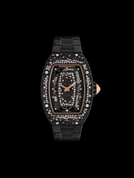·星系系列——RM 07-01星夜款(Starry Night):181颗大小形状各异的钻石镶嵌于金质镶爪中,点缀在Carbon TPT®碳纤维材质打造的“苍穹”之上,构成一幅引人入胜的星座图景。