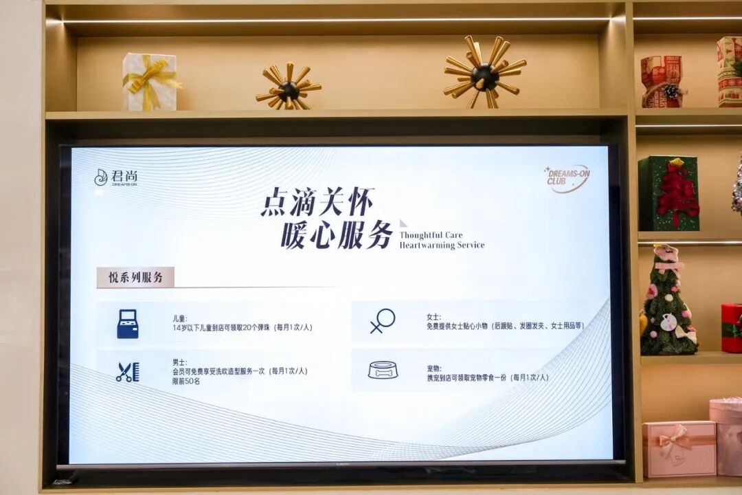 以“悦”为核心,长沙君尚推出四重定制服务:“悦”开心(儿童)、“悦”贴心(女士)、“悦”有型(绅士)、“悦”友好(宠物),让每一种需求都能得到精准满足;零售类商品如常规服饰箱包等享受30天超长无理由退换货,还有预约车位、代客泊车、派对定制、衣物洗护、节日礼遇等专属高端权益,让“被珍视”成为每一位顾客的日常体验。