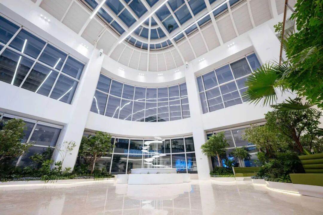 屋顶的云智慧农场里,生态与科技相互交织:微缩科技农场、共享菜园、植物认养互动等项目汇聚于此,成为劳动实践和自然教育的场所。来到5-6层,“都市森林”主题的阅光厅内,喷泉水池、灯帘瀑布与绿植花池相互映衬,阳光洒满的阶梯休憩区,既是雅致的社交场所,也是治愈心灵的角落。