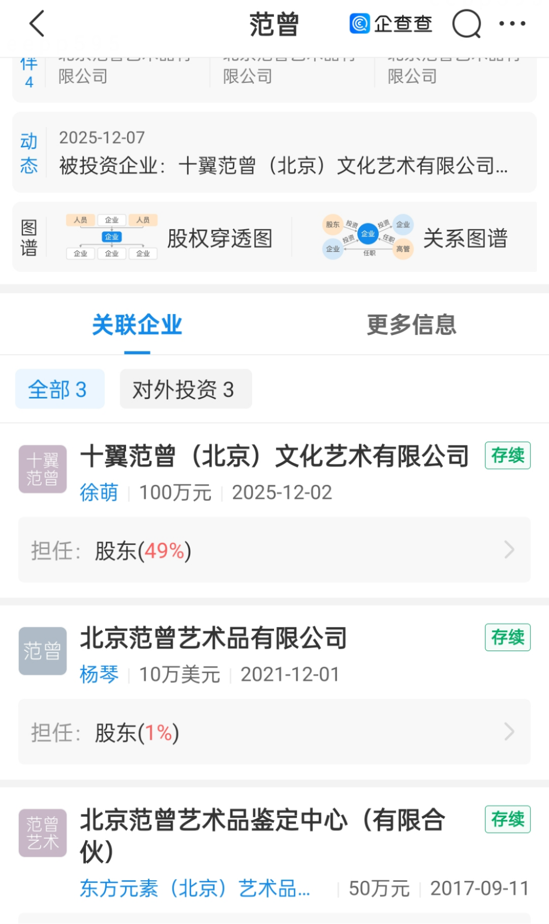 企查查上的信息,也印证了这份声明背后的布局,范曾名下关联着三家公司。