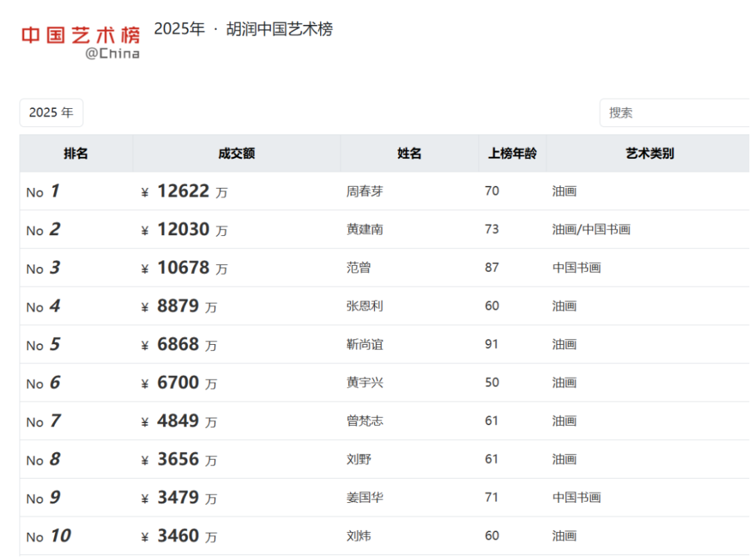 2008年至2009年,范曾在该榜单中分别位列第15位和第11位,当时年度成交额尚未突破亿元。这一局面从2010年开始转变,其作品成交额大幅攀升,当年以1.48亿元排名第3位。此后,范曾在2011年以3.9亿元成交额首次登上该榜榜首,并于2012年以9.38亿元的历史高点蝉联冠军。