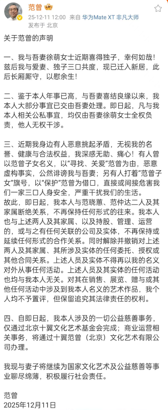 活动结束后,认证账号@范曾同步更新了近况。他透露自己添了幼子、搬了新家,生活安稳幸福。同时他坦言,随着年纪增长,今后家中大小事务将全部交给妻子徐萌打理。