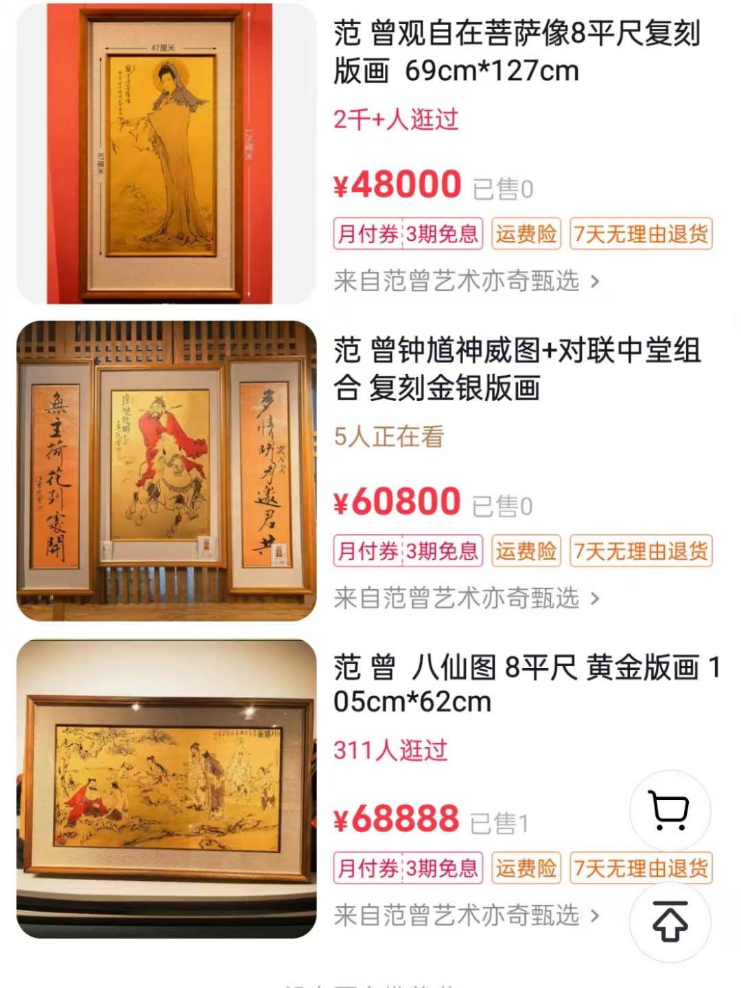主播在直播间内热情推销88元的范曾马年限定原创茶杯,以及售价4.8万元的《钟馗神威图》复刻金版画。