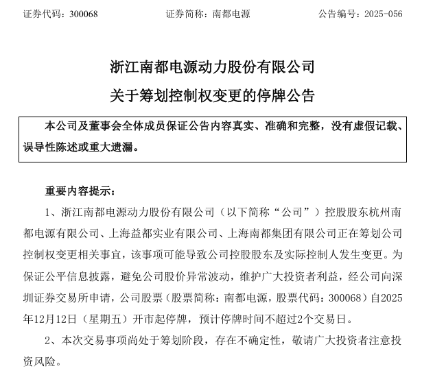 南都电源(300068)12月11日晚间发布公告,宣布公司股票将于2025年12月12日(星期五)开市起停牌。