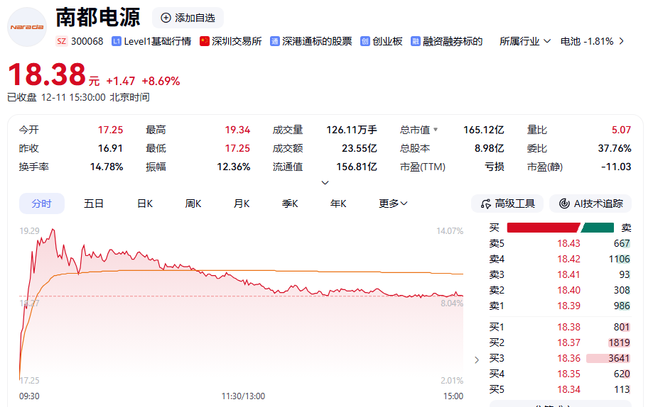 在盘面上,南都电源今日早盘一度涨超14%,随后涨幅收窄,截至收盘上涨8.69%,报18.38元/股,总市值达165.12亿元。