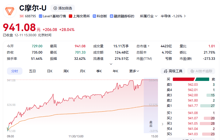 从盘面来看,摩尔线程当日大涨28.04%,最新股价为941.08元/股,总市值达4423亿元。上市仅5个交易日,该股累计涨幅已超700%。若中签新股的投资者持有至今,按收盘价计算,单签浮盈超40万元。