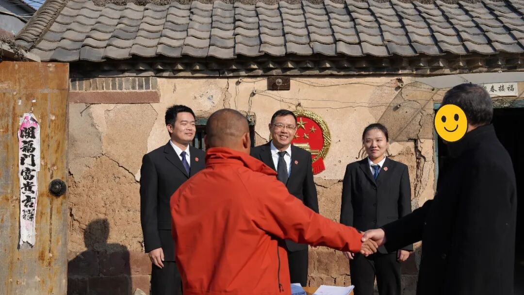 宅院里,在庄严的国徽下,文家叔侄俩在法官的见证下,当场握手言和,激动地向法官表达谢意。