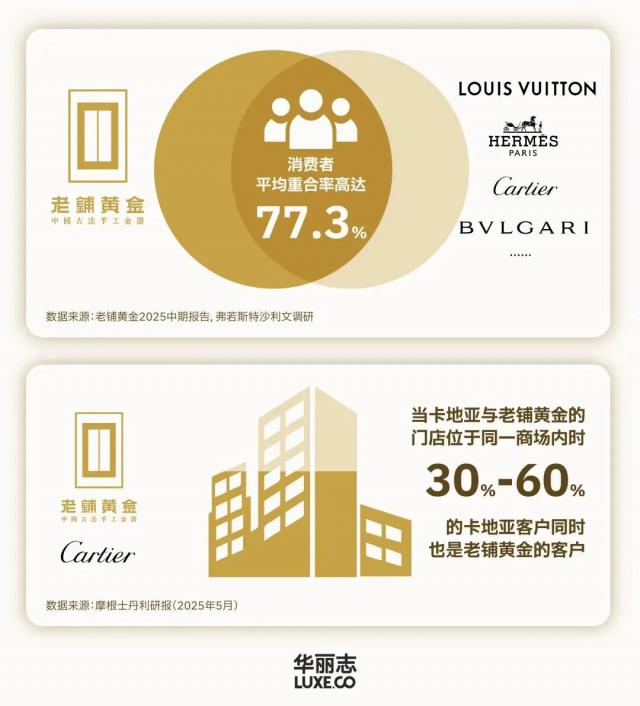弗若斯特沙利文调研还显示,老铺黄金消费者与路易威登、爱马仕等国际奢侈品牌消费者平均重合率达77.3%。摩根士丹利研究指出,在双方门店共存的商场,30%-60%的卡地亚客户也是老铺黄金客户,这意味着老铺黄金已被中国高端消费者全面拥抱,契合其消费习惯、审美偏好和生活方式。
