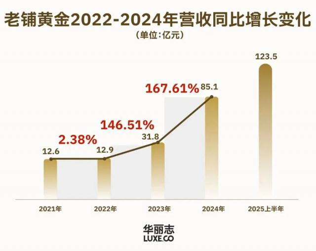 过去三年,老铺黄金实现“指数级增长”:2022年营收同比增2.4%,2023年跃升至146.5%,2024年达167.61%,2025年预计超200%。
