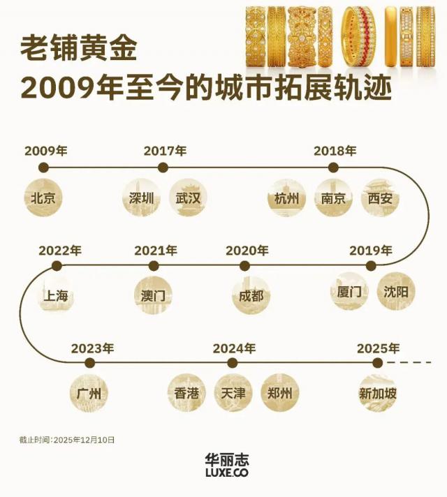 2009年老铺黄金从北京起步,逐步进入深圳、武汉、杭州等城市,2021年后拓展至澳门、上海、广州、香港,2025年进入新加坡,迈出“出海”第一步。
