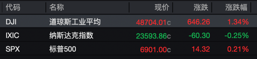 当地时间12月11日,美股三大指数呈现分化走势,道琼斯工业平均指数上涨1.34%,纳斯达克综合指数下跌0.25%,标准普尔500指数上涨0.21%。大型科技股多数走低,甲骨文因财报不及预期股价大跌超10%;中概股同样涨跌互现,纳斯达克中国金龙指数微跌0.09%。