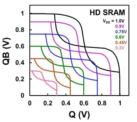 SRAM单元采用6晶体管配置,分为高密度(HD)型与高电流(HC)型,均验证可正常工作。HD型面积比同设计规则纳米片FET单元小30%,比HC型小20%;HC型读取电流为HD型1.7倍。HD型工作电压0.3V-1.0V,0.75V时读取静态噪声容限(RSNM)135mV、读取电流17.5μA、写入容限(WM)265mV,参数仍有优化空间。SRAM的交叉耦合结构需通过BCT接触点实现上下FET互连。