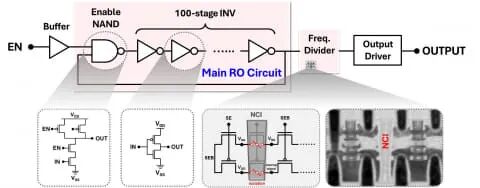 台积电研发团队制作了两类集成电路原型:逻辑电路基础的环形振荡器,以及存储电路核心的SRAM单元。其中环形振荡器规模达800-1000个晶体管,由使能NAND元件与100个反相器组成101级结构,工作电压范围0.5V-0.95V,电压升高时振荡频率提升、波动减小。