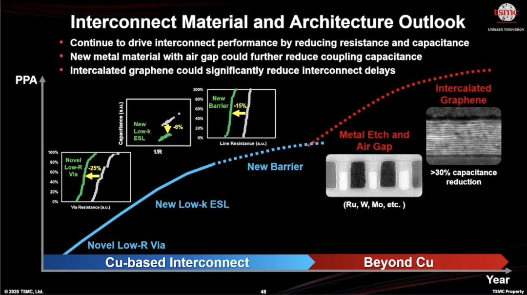 此外,台积电在二维沟道材料晶体管领域也有进展,展示了类似N2技术的堆叠纳米片单层沟道晶体管电性能,及匹配良好的N/P沟道器件组成的1V工作反相器。未来还计划研发新型互连技术,包括铜互连的过孔方案优化、新型阻挡层,以及气隙金属材料、插层石墨烯等,以降低电阻与耦合电容。