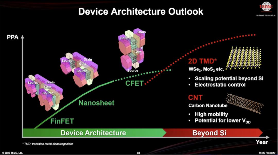行业专家认为,在CFET普及前,纳米片架构将经历三代发展,期间CMOS元件(如SRAM)尺寸缩小可能停滞。比利时微电子研究中心(imec)预测,2032年工艺节点微缩速度放缓,将迫使行业依赖芯粒与先进封装技术,而CFET是继续实现逻辑电路与SRAM微缩的关键路径,有望超越1纳米节点。