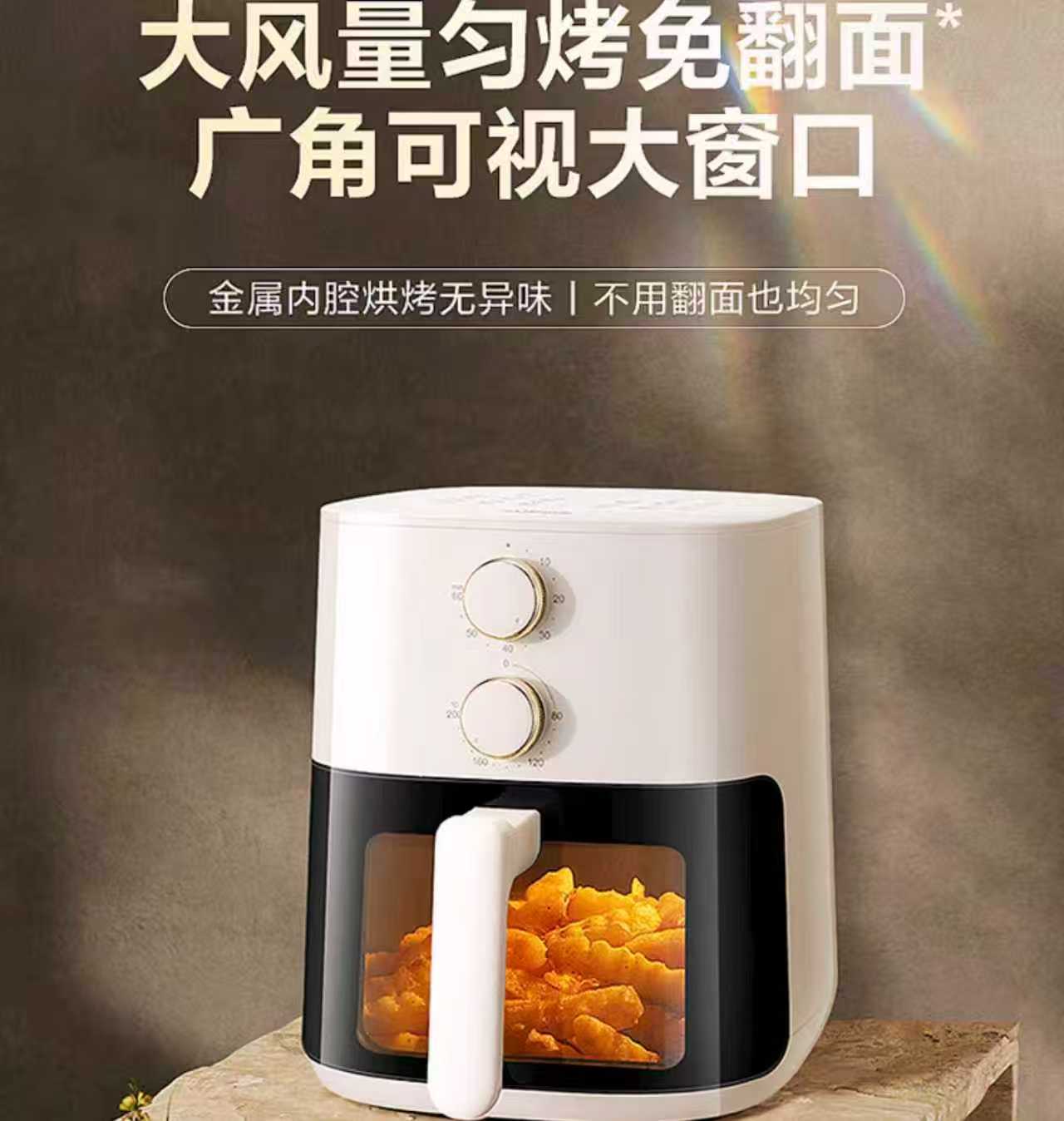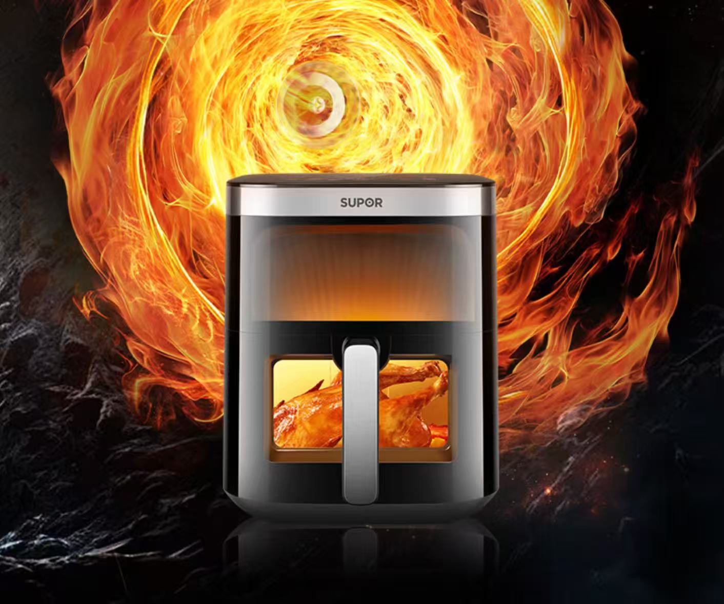 针对翻面问题,九阳、美的、苏泊尔推出重新设计风道的新品,形成更流畅的环绕式热风,多数食材无需手动翻面;可视化设计的空气炸锅已占市场份额一半以上。苏泊尔近期新品应用龙卷风循环加热技术,通过涡流结构让热空气螺旋上升形成立体气流,提升加热效率,厚切牛排、整只小鸡都能均匀烤熟。