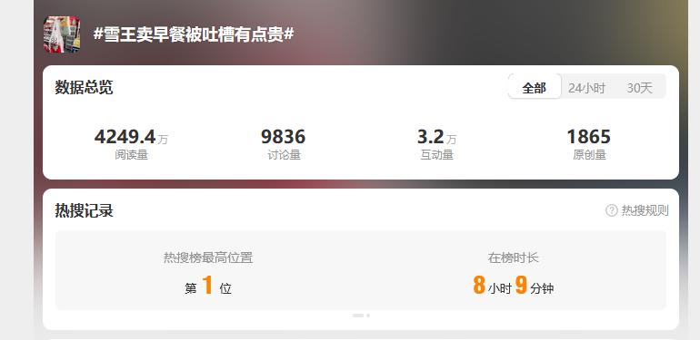 然而,不少网友认为7.9元的套餐定价偏高。有网友算了一笔账:“一个包子2元,一杯豆浆1.5元,传统早餐只要3.5元,蜜雪冰城的套餐要7.9元,确实不便宜。”相关话题“#雪王卖早餐被吐槽有点贵#”甚至登上微博热搜榜,阅读量突破四千万。