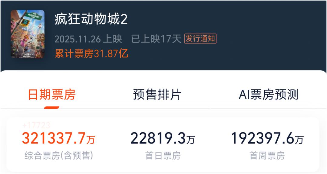 据Box Office Mojo数据,截至目前,《疯狂动物城2》北美票房达2.28亿美元(约合人民币16.07亿);而灯塔专业版数据显示,该片国内票房已突破32亿,预测总票房将超38亿。