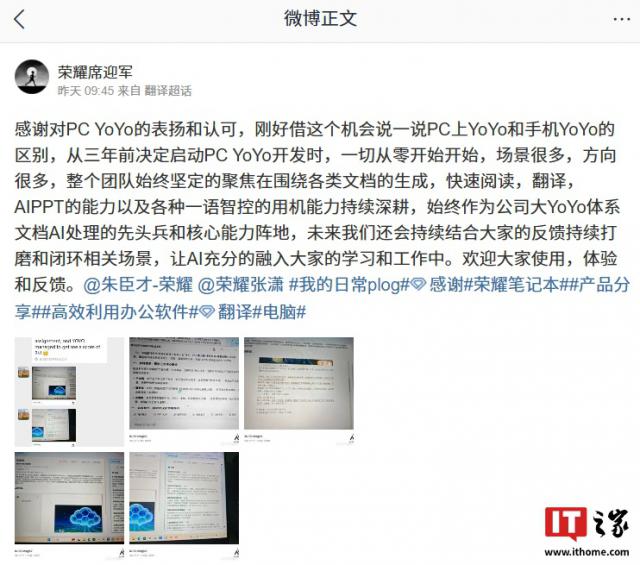 IT之家12月14日消息,荣耀全场景软件主理人席迎军昨日发文阐述了PC端YOYO与手机YOYO的差异。他提到,三年前启动PC YOYO开发项目时,团队面临着从零起步、应用场景繁杂、发展方向多元等诸多挑战。