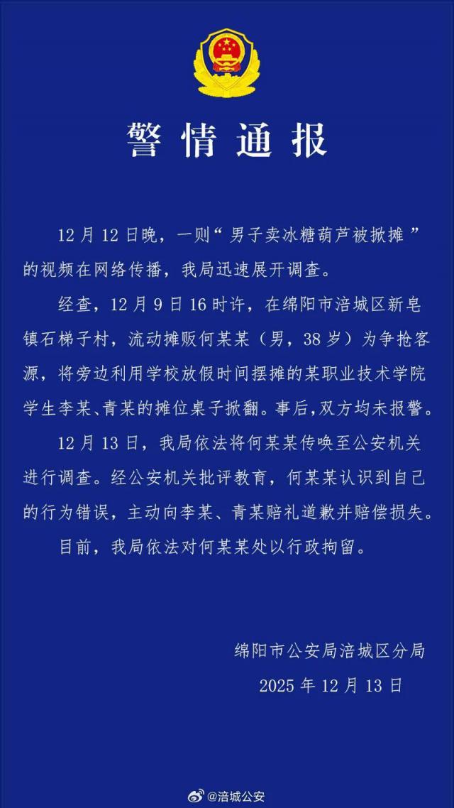 12月13日晚,四川省绵阳市公安局涪城区分局发布警情通报,就网传“男子卖冰糖葫芦被掀摊”事件作出回应。