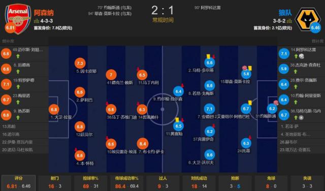 最终,阿森纳主场2-1险胜狼队,暂时以5分优势领跑积分榜;狼队则遭遇十连败,以2分垫底。