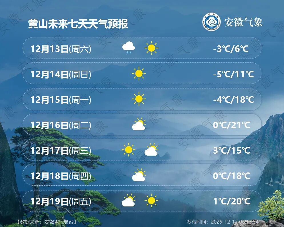 再把目光转向黄山,寒潮的影响趋于结束,预计未来7天黄山以晴天为主。冷空气过后,今晨黄山的最低气温降至-5℃,从15日起气温逐步回升。