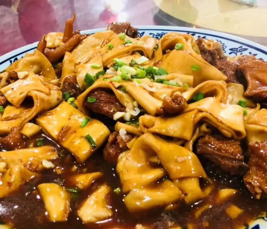 驴肉黄面是敦煌最具代表性的特色小吃,由筋道黄面搭配炖煮驴肉而成,汤汁鲜香、肉质细嫩、口感鲜美。
