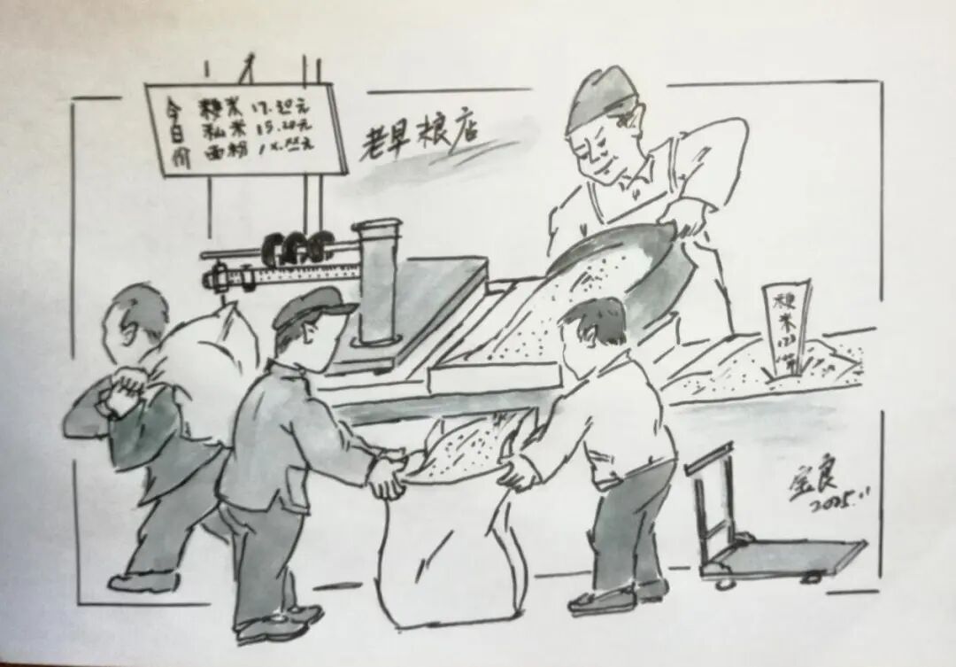 粮店,上海人习惯叫“米店”,过去每月家家户户都要凭购粮证或粮票,去购买每个人的定量粮食。熟悉的店员会在相对好的米进店时,通知附近居民去买,大家就带着米袋和相关盛具去米店排队,不像现在大多是定量包装的粮食。