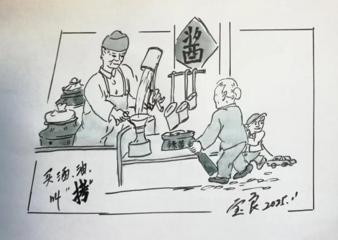 北方人称“打酒”,上海人则叫“拷”酒,买食用油、酱油、醋也用这个叫法,而且都得自带瓶子和罐头去盛放,这在当时是孩子们常做的家务。食用油是按人头定量、凭票供应的,店家常用不同高低的毛竹管做量具,称之为“提”。