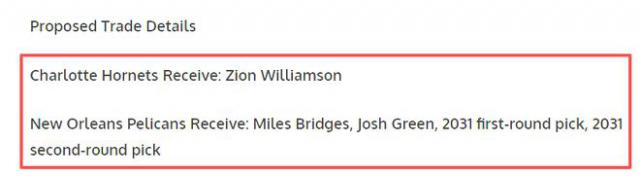 若黄蜂留三球,引进锡安可组双子星。锡安在鹈鹕生涯坎坷,与三球搭档能获更多得分机会,减少伤病。健康的二人组将成联盟极具观赏性的组合。鹈鹕通过交易获布里奇斯的得分、格林的防守和选秀权,调整阵容。