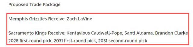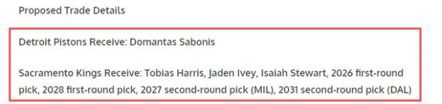 国王得到:托比亚斯·哈里斯、贾登·艾维、以赛亚·斯图尔特、2026年首轮签、2028年首轮签、2027年次轮签(雄鹿)、2031年次轮签(独行侠)